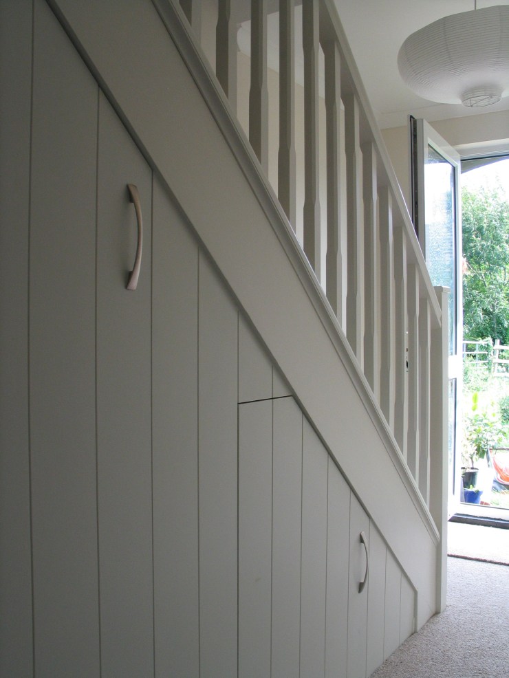 If your looking for more storage, why not look under the staris? This pair of doors made a previously inacessable and crammed space easy to use and along with changing the 60’s metal banister transformed the hallway into a great entrance.