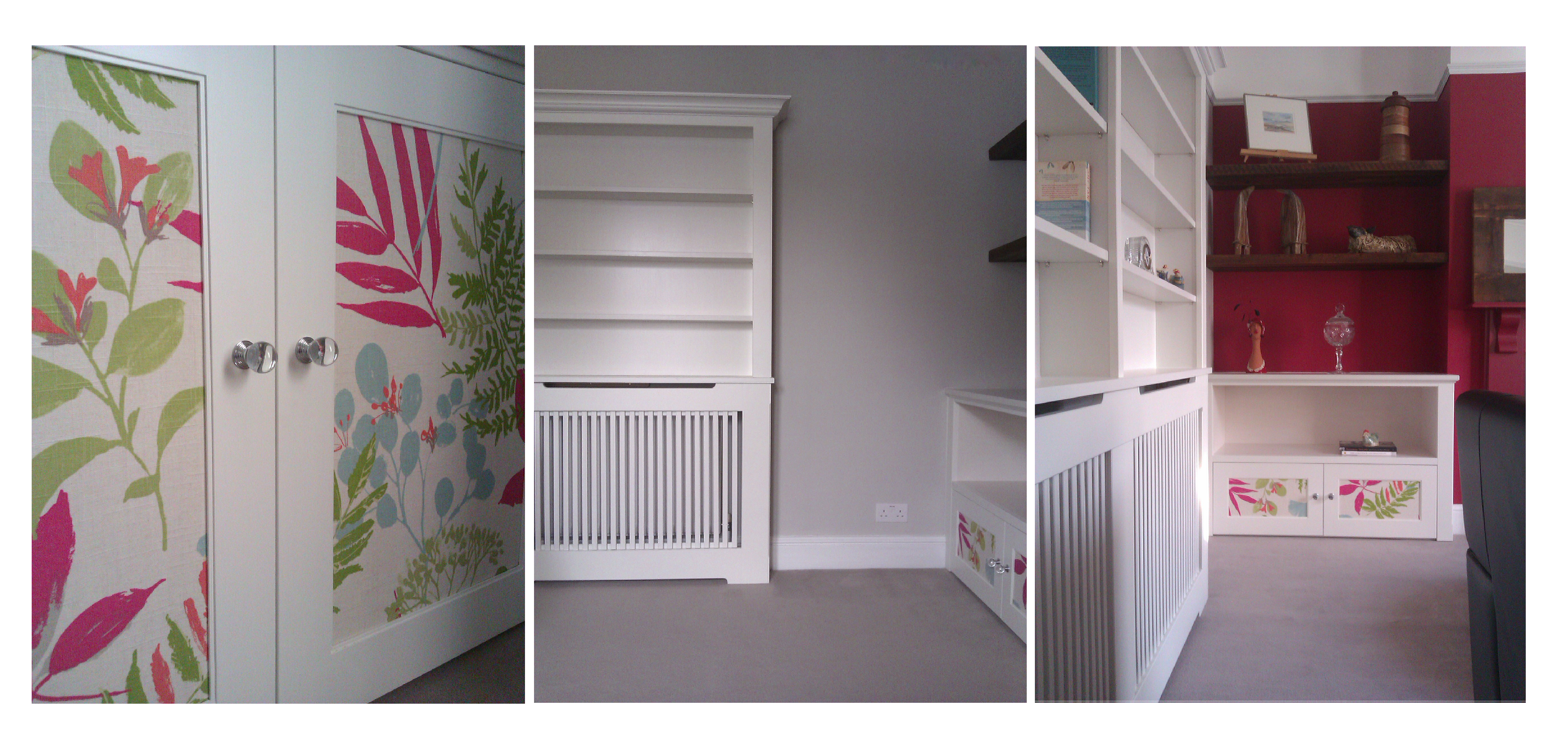 Along with the colourful cloth panels, we made a popular ideas that works well, the “Bookcase Radiator Cover”. Providing storage and screening the radiator.
